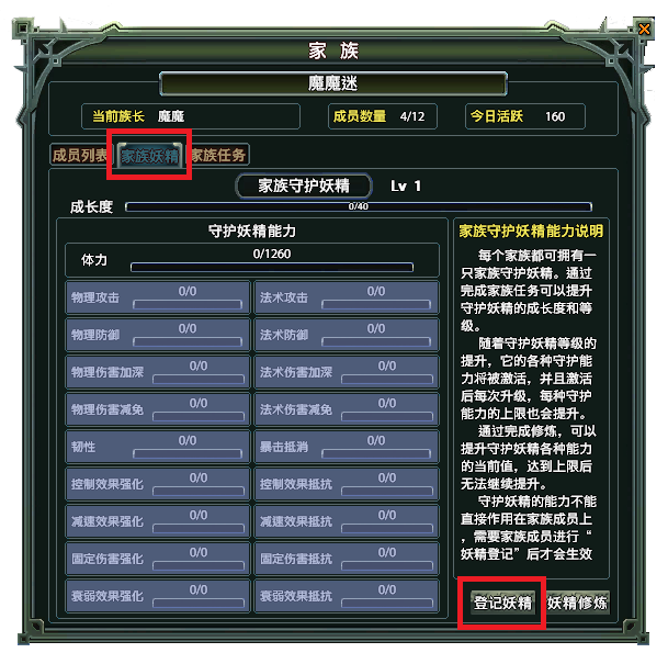 - 每1位家族成员,均可在家族内登记1名妖精