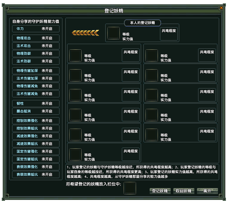 - 所登记的妖精,妖精等级不能大于角色等级