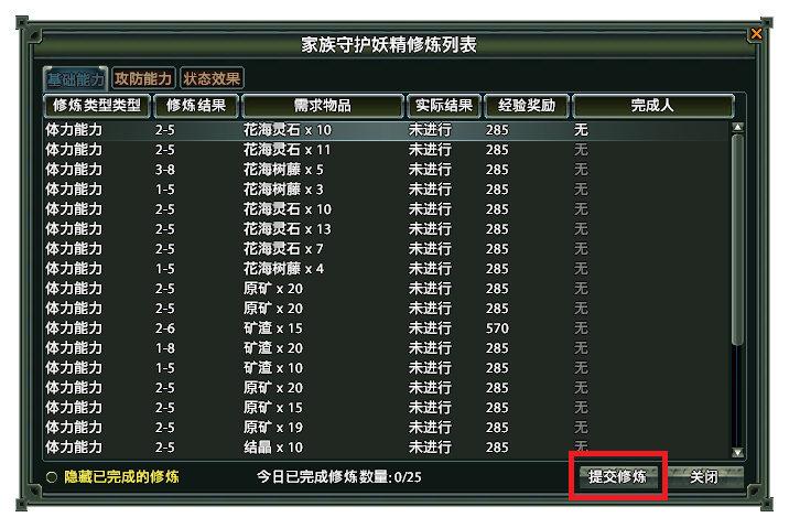 4、妖精修炼任务主要以收集道具为主,不同的任务奖励的经验以及增加的妖精能力不同。根据家族守护妖精当前的等级和拥有的能力,随机刷出对应的修炼任务。