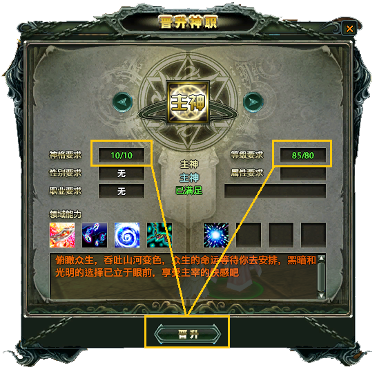 玩家符合竞选标准后界面会有相应提示,条件满足后点击报名就可以竞选相应的神职