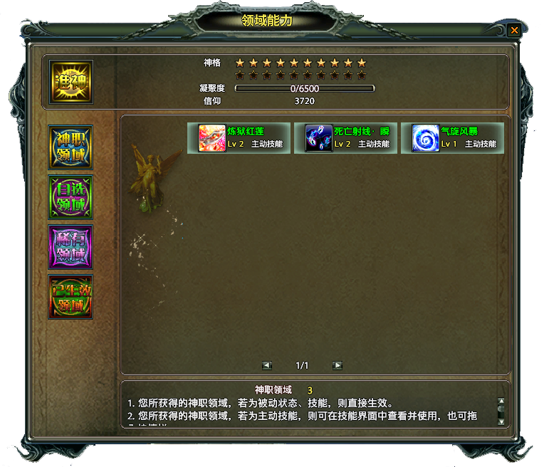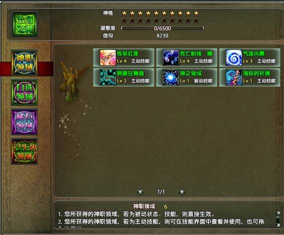 神职领域中的技能是晋升神职后自动获得(包括竞选的神职),当角色达到20级的时候,就可以到“三界主宰艾辛萨”那里晋升第一个神职“神侍”,晋升结束 后,就会拥有“神侍”的领域技能“炼狱红莲”和“死亡射线·瞬”(这两个技能是变身技能,神化之后才能够使用,而且变身技能有专门的快捷栏,无法拖入普通快捷栏)。随着角色等级和神格的提升,可以晋升更高等级的神职,学习更多的技能。