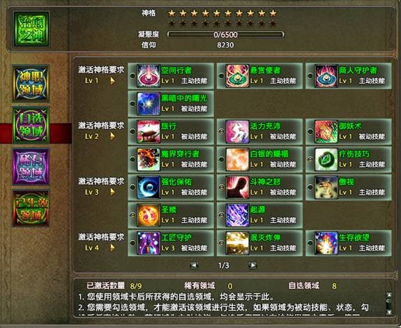 自选领域中的技能是通过学习领域秘卷获得,不同技能学习的时候消耗的信仰值不同。技能学习成功后,不会立即生效,需要到“自选领域”分页中激活技能。自选领域技能的学习数量没有限制,但是同时激活的技能有数量限制,神格等级越高,可以同时激活的自选领域技能就越多。领域秘卷的获得途径有很多:副本稀有怪掉 落、神钻碎片商店购买、神钻商店购买、斗技场金币兑换、统治勋章兑换、用神秘卷合成。